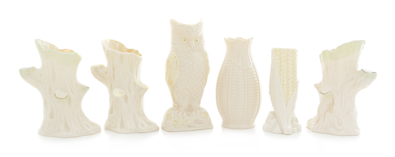 of various patterns, including three Stump vases, an example in the form of an owl, an example in the form of an ear of corn and others.