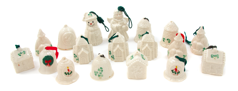 of various forms and sizes, comprising three sets of three, a pair and five individual examples, together with two Belleek 2000 bells; 18 items total.