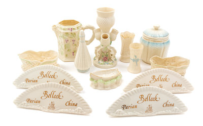 comprising a centerpiece, two vases, a covered jar, a bottle, a pitcher, a boat form salt, two oval planters and four Belleek advertising signs.