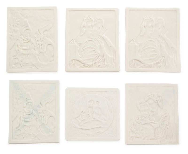comprising five examples of rectangular form and one of square form, each worked to show a figural scene.