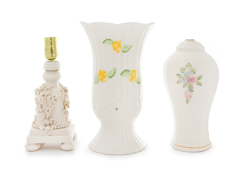 comprising a Belleek Collectors Society vase and two table lamps.