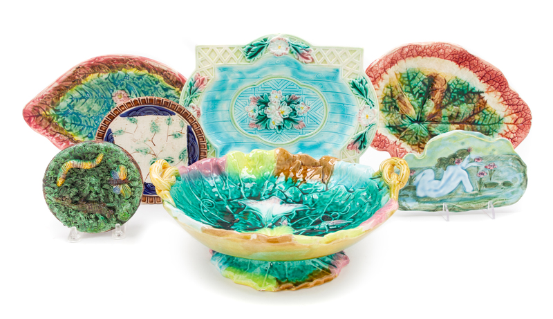 comprising a center bowl, four trays, a saucer and a Palissy style dish; 7 items total.