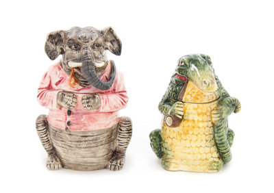 one example modeled to show an anthropomorphized elephant, the other in the form of an alligator.