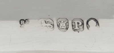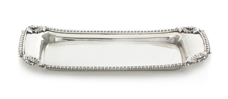 of rectangular form with a gadroon rim, the corners worked to show rocaille and foliate scrolls.