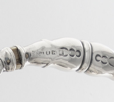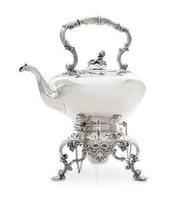 the lid with a blossom finial, the lamp stand with a pierced body, raised on three S-scroll legs.