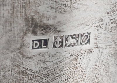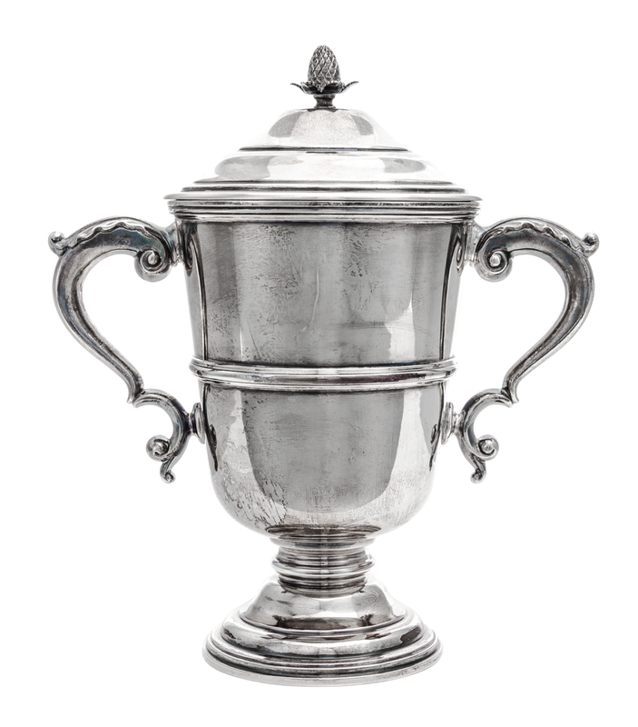 the domed lid having a pinecone finial, the body with a banded collar and acanthus capped S-scroll handles, raised on a stepped circular foot.