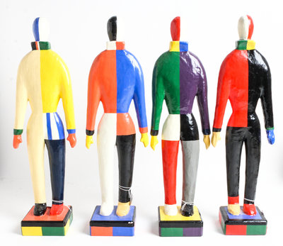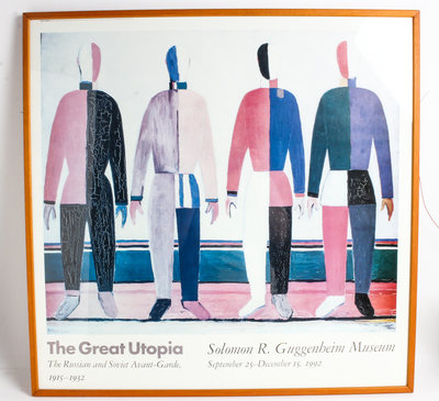 the figures decorated in the Soviet Avant-garde style, commemorating The Great Utopia exhibition, together with a museum poster.