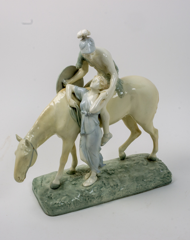 depicting a classical soldier on horseback with a woman at his side.