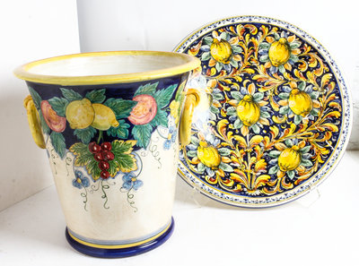 the body decorated with fruit and foliate motifs, together with a similarly decorated majolica charger.