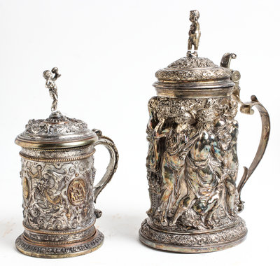 comprising a Victorian silver-plate electrotype tankard worked to show a continuous band of Bacchic revelers and surmounted by a Bacchic putto, engraved From the Original in Ivory/ Executed by Elkington, Mason & Co./ In the Possession of Henry C. G. Bedford Esqr. to the underside, together with a similarly decorated silvered metal electrotype example.