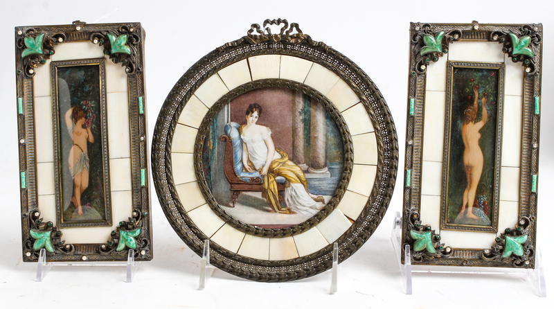 comprising a circular example painted to show a draped lady, the other two rectangular examples depicting nudes in a forest, each within an ivorine inset frame.