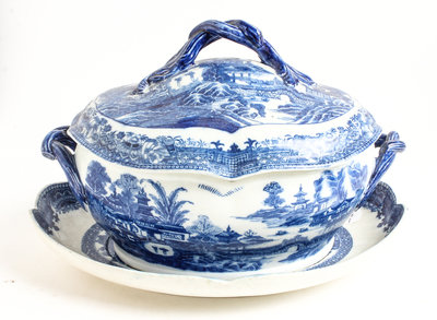An English Blue and White Porcelain Soup Tureen and Undertray