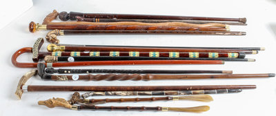 A Collection of Carved Wood and Gilt-Metal Topped Walking Canes