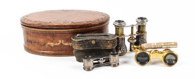 Two Pairs of French Opera Glasses and a Leather Clad Jewelry Casket