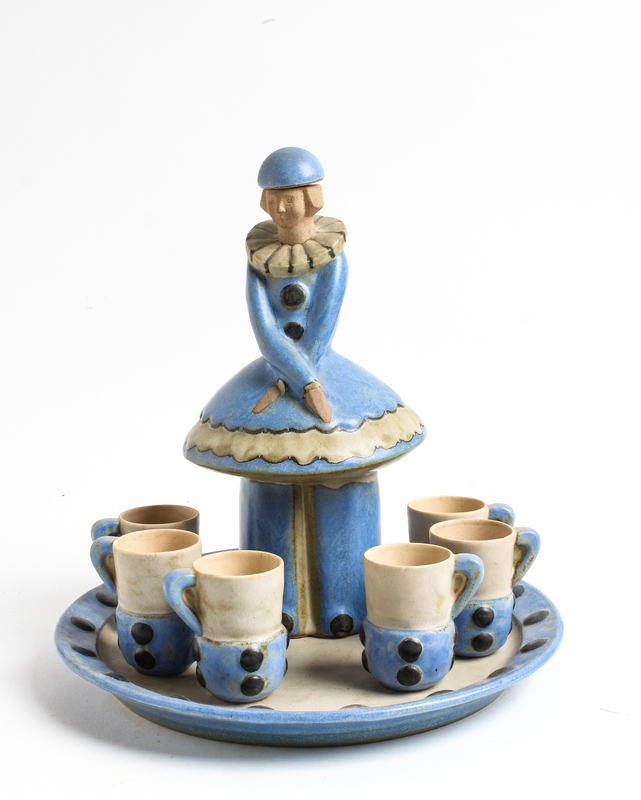 A Ceramic Figural Decanter and 6 Cups, with a Charger