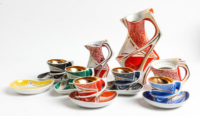 comprising 6 dishes, 5 espresso cups, a small and larger creamer, marked to underneath