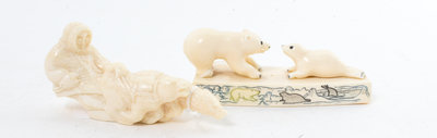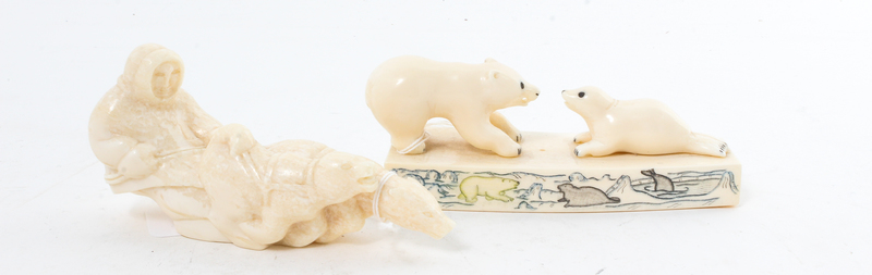 in the form of a seal and bear atop a carved base and a sled team driven by an Indigenous figure.