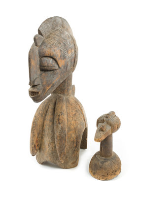comprising a Senufo Nimba mask and a bird's head raised on a circular wood base.