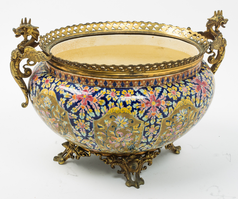A Continental Gilt Metal Mounted Faience Jardiniere
