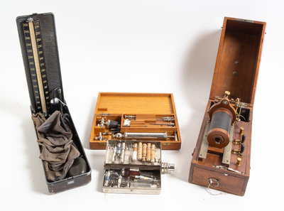 comprising a Baumanometer sphygmomanometer in a fitted travel case, a German tooth veneer swatch, two electrical quack medicine devices and other medical implements.