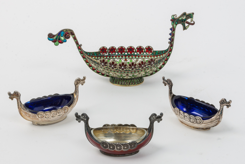 each in the form of a Viking ship, comprising a champleve enamel example, one enameled example and two silver examples with blue glass liners.