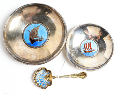 each of circular form centered by an enameled roundel depicting a Viking ship at sea, together with an associated gilt-silver and enameled sugar scoop by Gorham Mfg. Co.