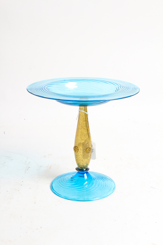 a celeste blue glass compote, form no. 6043, with mica flecked amber stem and applied prunts to stem