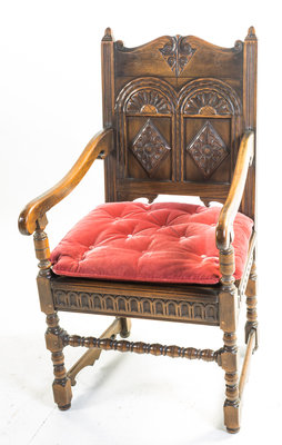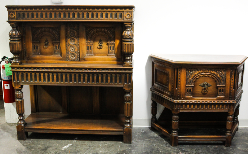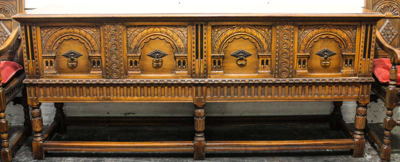 from the Haddon line in the Elizabethan taste, comprising an extension table, a sideboard, a cabinet, a server and eight chairs.