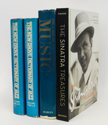 4 volumes, comprising The New Grove Dictionary of Jazz, edited by Barry Kernfeld, Vol. 1 A-K and Vol. 2 L-Z; The Larousse Encyclopedia of Music, edited by Geoffrey Hindley, 570 pp., 1971; and The Sinatra Treasures, archived by Charles Pignone including photos, mementos, more than 200 black and white and full color images, 30 removable artifacts, selected recordings and a 60-minute compact disc, published in China, first edition 2004.