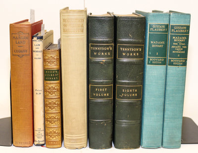 comprising Alfred Lord Tennyson's Works Centenary Edition; NY and London; 1909; 8 volumes original 3/4 blue Morocco; No 55 of 1000 sets, Gustave Flaubert's Complete Works; 10 volumes, Reminiscences of General Basil W. Duke, CSA, Roscoe Pound's Law Morals, Lee Richardson's You Should Have Been Here Yesterday (signed) and CUDAHY, John (1887-1943). Mananaland. Adventuring with Camera and Rifle Through California in Mexico. New York.