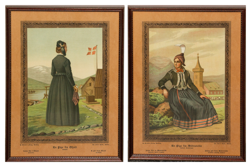 En Pige fra Ofjord. -- En Pige fra Modruvellir.2 lithographic plates with hand-coloring from Danske Nationaldragter, [ca 1861], plate 26 x 18 mm, on wove paper, mounted and framed (not examined out of frame).