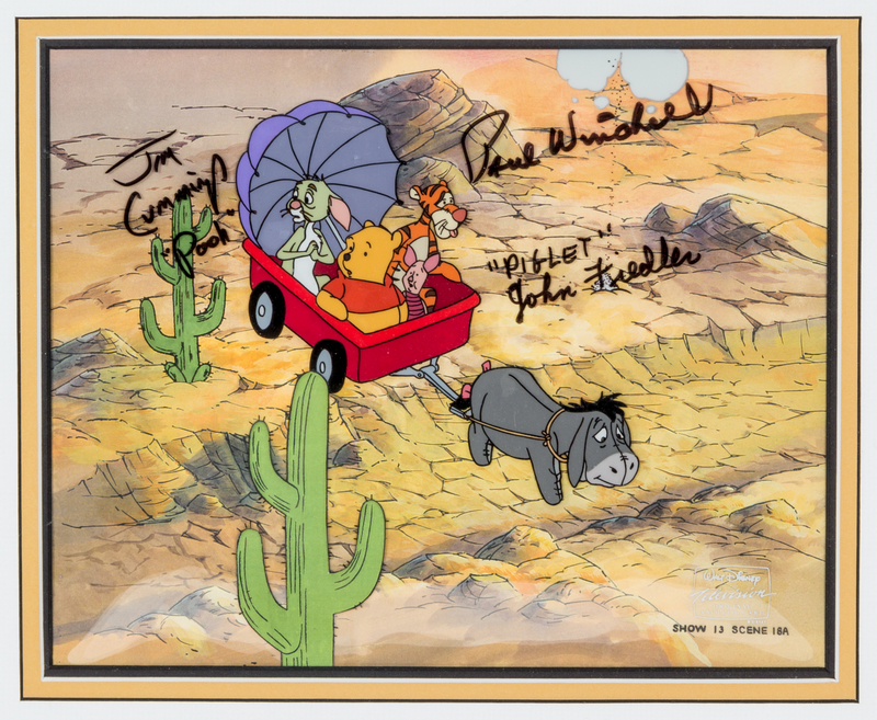 Original animation cel of Eeyore, Piglet, Tigger, Rabbit, and Winnie the Pooh from a scene from the animated Disney series "The New Adventures of Winnie the Pooh." Signed by voice actors Jim Cummings (Pooh), John Fiedler (Piglet), and Paul Winchell (Tigger).