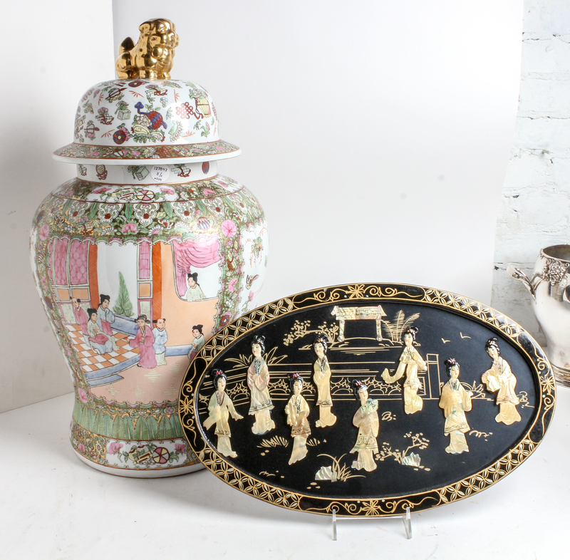 the body of baluster form decorated with a polychrome garden scene, the lid with a gilt fu dog finial, together with an enamel and mother-of-pearl inset plaque.