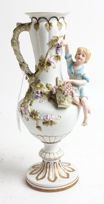 of baluster form, the body modeled to show a handle in the form of a grapevine and a boy picking grapes, raised on a circular foot, numbered 6769 in iron red to the underside.