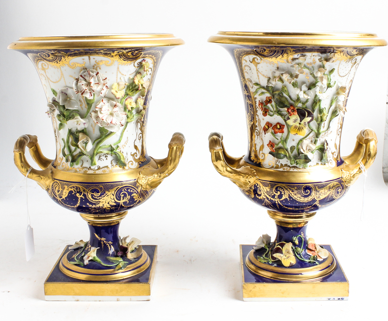 each of campagna form, with encrusted floral decoration against a cobalt ground with gilt highlights, raised on a square plinth.