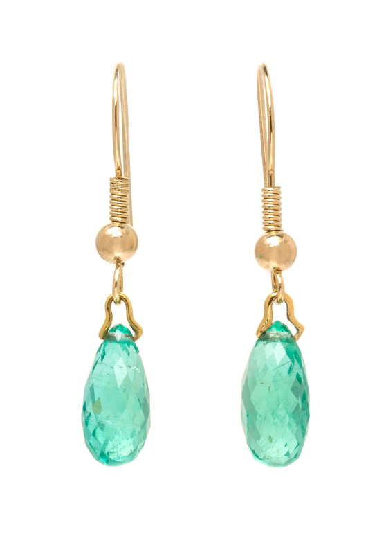 containing two briolette cut emeralds measuring approximately 13.19 x 6.15 x 7.80 mm and 12.92 x 6.32 x 7.87 mm respectively.Stamp: 14K.