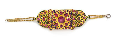 A High Karat Gold, Ruby and Polychrome Enamel Bazuband Bracelet, Indian,