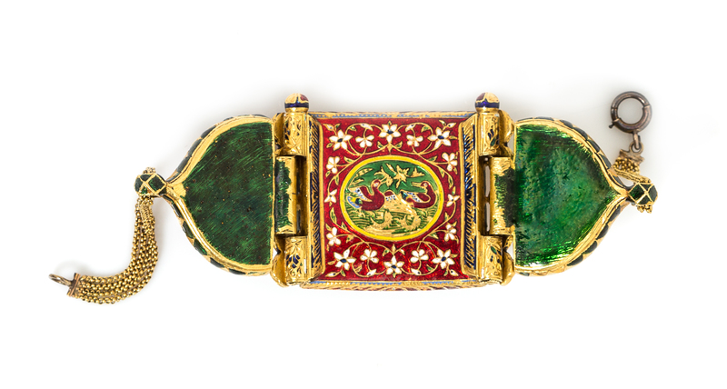 in Mughal style, consisting of a three panel design, the center containing numerous foil backed oval and pear shape cabochon cut rubies and paste stones set against blue and green enamel backgrounds, the sides, hinge pins and reverse with polychrome enamel in shades of white, red, green, light blue and dark blue, attached looped double strand round belcher link chain, gold tone clasp.