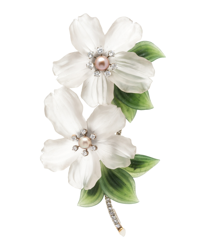 consisting of two rock crystals carved in the form of flowers, the centers containing two pearls measuring approximately 5.77-6.44 mm in diameter and 13 round brilliant cut diamonds weighing approximately 0.77 carat total, the stem accented with 13 round single cut diamonds and five carved nephrite leaves. Stamp: (CB maker's mark) (Austrian assay marks).