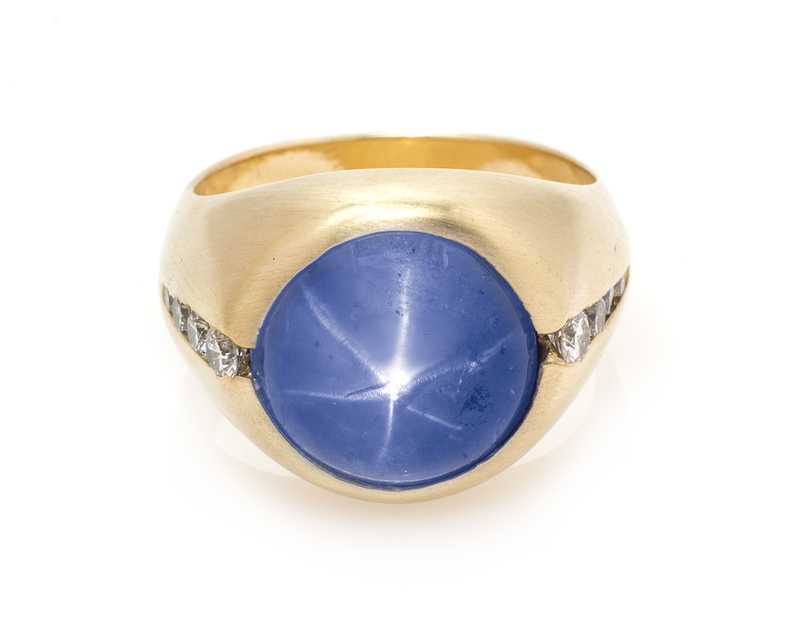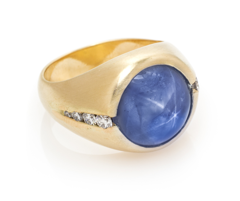 containing one round cabochon cut star sapphire weighing 12.72 carats, and eight round brilliant cut diamonds weighing approximately 0.30 carat total.Accompanied by a Gemological Institute of America sapphire origin report number 1182679294, dated August 25, 2017, stating Species: Natural Corundum, Variety: Natural Star Sapphire, Origin: Sri Lanka, Treatment: No indications of heat.
