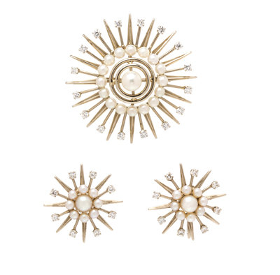 consisting of a brooch containing one cultured pearl measuring approximately 5.96 mm in diameter, 16 pearls measuring approximately 3.15 mm in diameter and 16 round brilliant cut diamonds weighing approximately 0.64 carat total, together with a pair of screwback earclips containing two pearls measuring approximately 5.20 mm in diameter, 16 pearls measuring approximately 2.75 mm in diameter and 16 round brilliant cut diamonds weighing approximately 0.64 carat total.Stamp: 14K (Fisher & Co. maker's mark).
