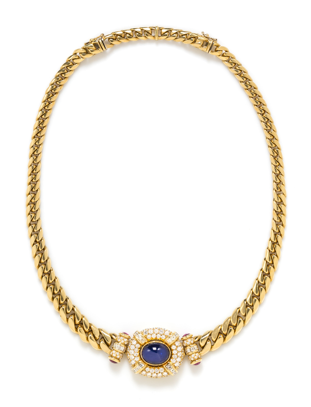 An 18 Karat Yellow Gold, Sapphire, Diamond and Ruby Necklace, Mayor's,