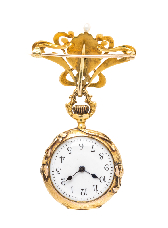 consisting of a brooch with a scrollwork design, the center containing the polychrome enamel face of a maiden wearing flowers and a headdress containing 10 round single cut diamonds and a seed pearl (origin not tested), the brooch suspends an open face lapel watch, 27.00 mm case diameter, white dial, Arabic numerals, blued steel spade hands, case heavily chased and engraved with a floral motif containing three old mine cut diamonds, metal cuvette, stem wound and set 15 jewel nickel movement signed MOTTO.Pendant stamp: 14K.Inner case back stamp: 14K AW 272032 (Swiss hallmarks).