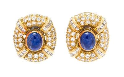 A Pair of 18 Karat Yellow Gold, Sapphire and Diamond Earclips, Mayor's,