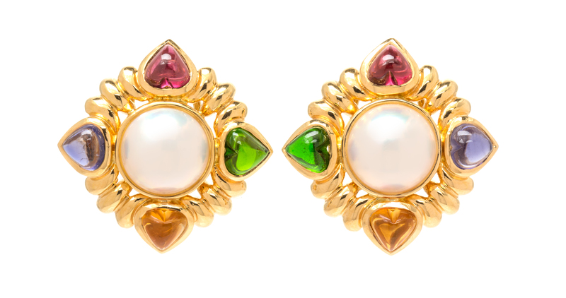 containing two mabe pearls measuring approximately 14.28 mm in diameter and two heart shape cabochon cut garnet, citrine, iolite and tsavorite garnets, posts with clip backs.Stamp: 18K (maker's mark).