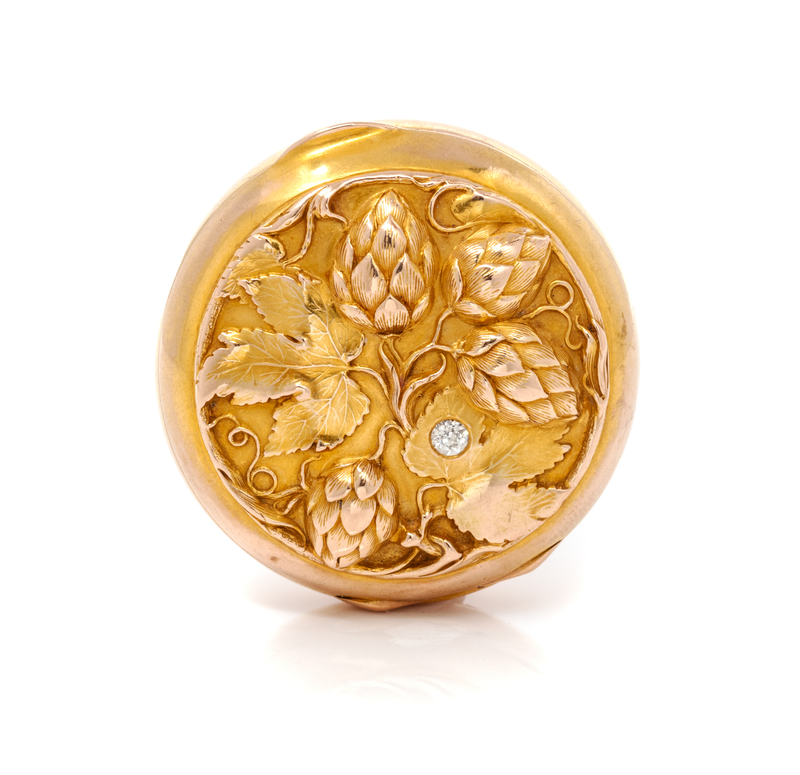 An Art Nouveau Yellow Gold and Diamond Acorn Motif Powder Case,