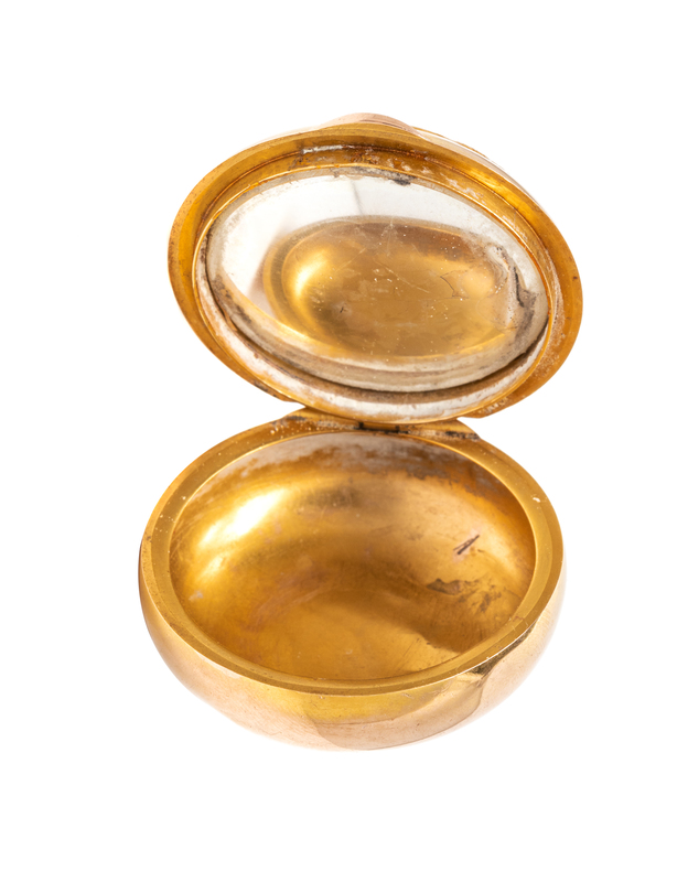 the lid decorated with a cluster of acorns and leaves, containing one old mine cut diamond measuring approximately 2.98 mm in diameter, hinged with mirrored interior.