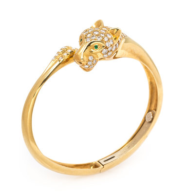 An 18 Karat Yellow Gold, Diamond and Emerald Bypass Panther Bracelet, Italian,