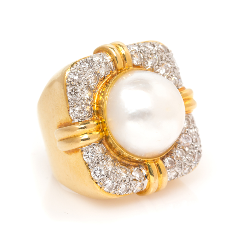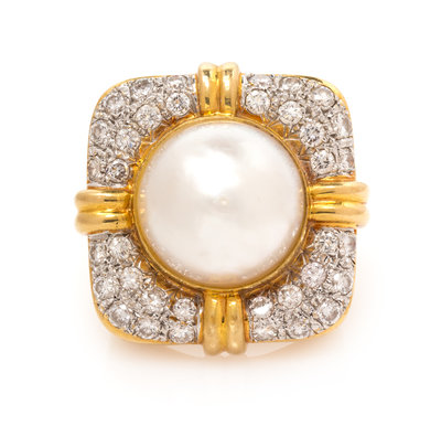 An 18 Karat Bicolor Gold, Cultured Mabe Pearl and Diamond Ring,