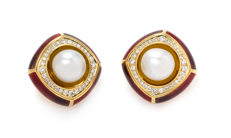 consisting of cushion shape settings accented with translucent reddish-brown enamel over a textured ground, the centers contain two pearls measuring approximately 13.22 mm in diameter and numerous round brilliant cut diamonds weighing approximately 1.97 carats total. Stamp: 750 (British assay marks).Engraved: de Vroomen.